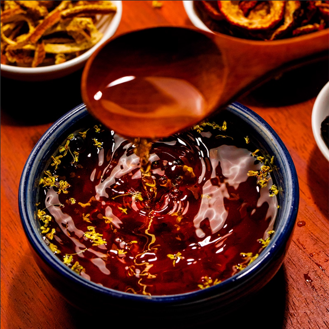 The dry blend offers an inviting aroma. When steeped in hot water, the osmanthus releases its bright, elegant fragrance, while the plum unfolds with smoky-sour notes and a mellow sweetness. The overall flavor is sweet and tangy, layered with hints of dried wood and caramel, making it soothing and refreshing.